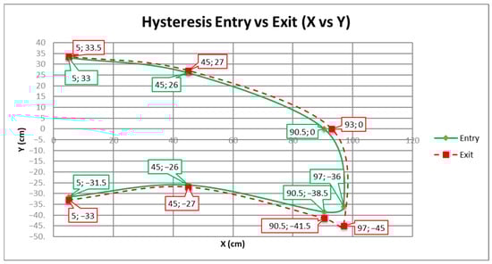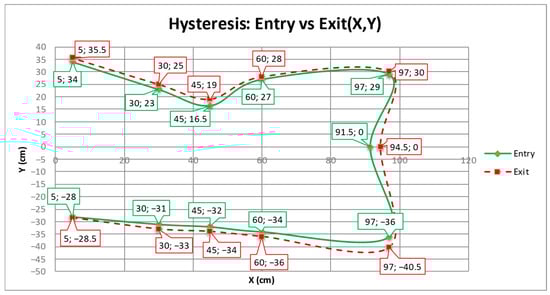 - Median zone (X = 45 cm): The readings are nearly overlapping (−26 vs. −27 cm; +26 vs. +27 cm), indicating a hysteresis of less than 1 cm and suggesting a clear and reproducible detection threshold.