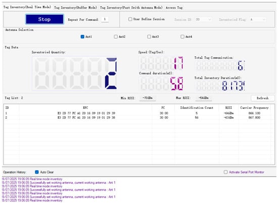 The test results confirm that all readings were performed with optimal accuracy. The reader correctly identified the number of tags entering the reading field, and no delays or reading errors were detected during the experiment. An example of multiple tags detection is presented in Figure 11.