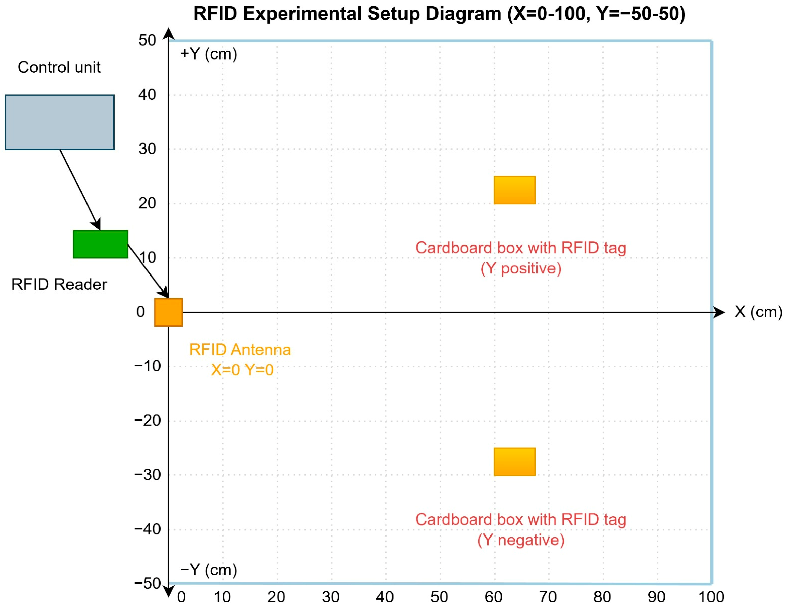 RFID antenna: A patch-type antenna employed for generating the reading field and connected to the RFID reader, positioned at the origin of the coordinate system (X = 0, Y = 0).