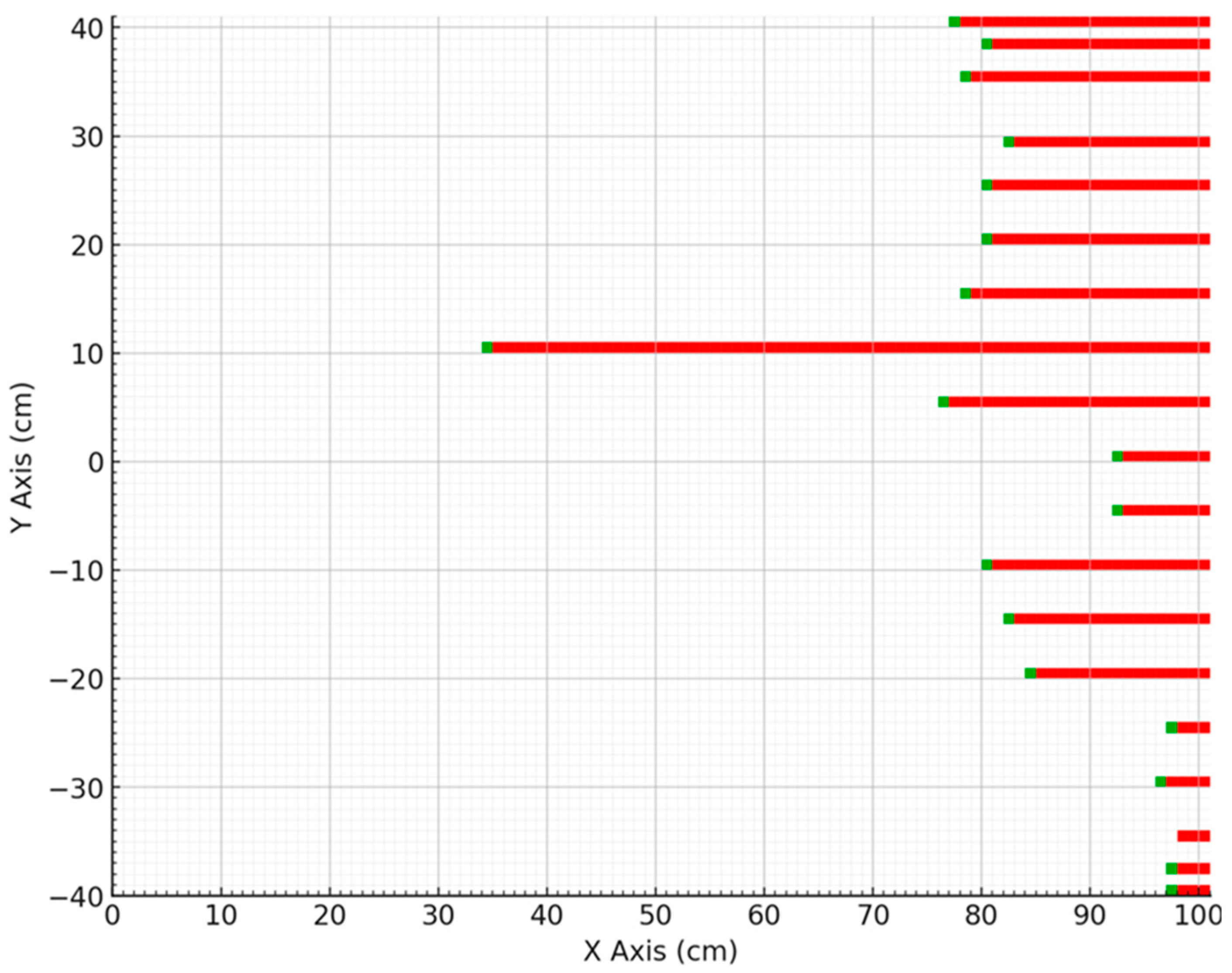 Proximal zone (X = 5–30 cm): The difference between entry and exit points ranges from approximately 1 to 2.5 cm (e.g., entry at Y = −28 cm and exit at Y = −28.5 cm; entry at Y = 23 cm and exit at Y = 25 cm). This small variation confirms high stability and a well-defined detection threshold.