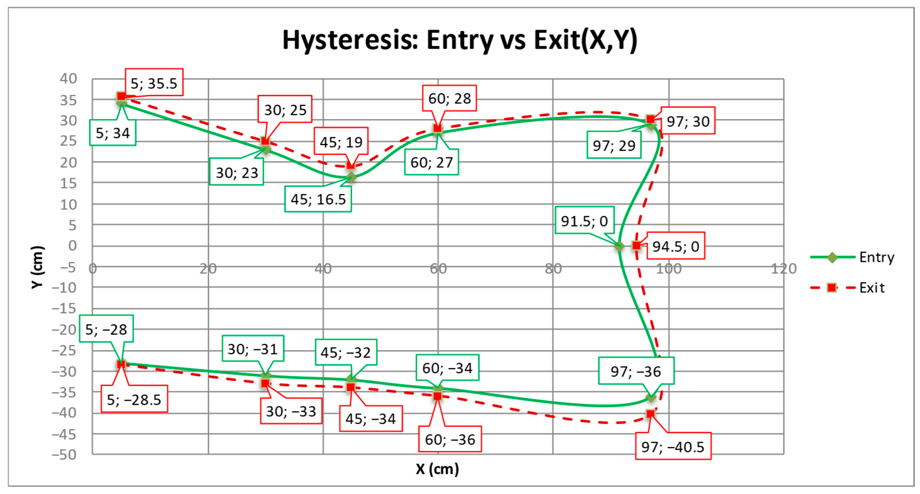 Distal zone (X = 91.5–97 cm): Hysteresis increases significantly, especially on the negative side of the Y-axis (entry at −36 cm and exit at −40.5 cm → difference of 4.5 cm). On the positive side, the amplitude of the phenomenon remains low (entry at 29 cm, exit at 30 cm).