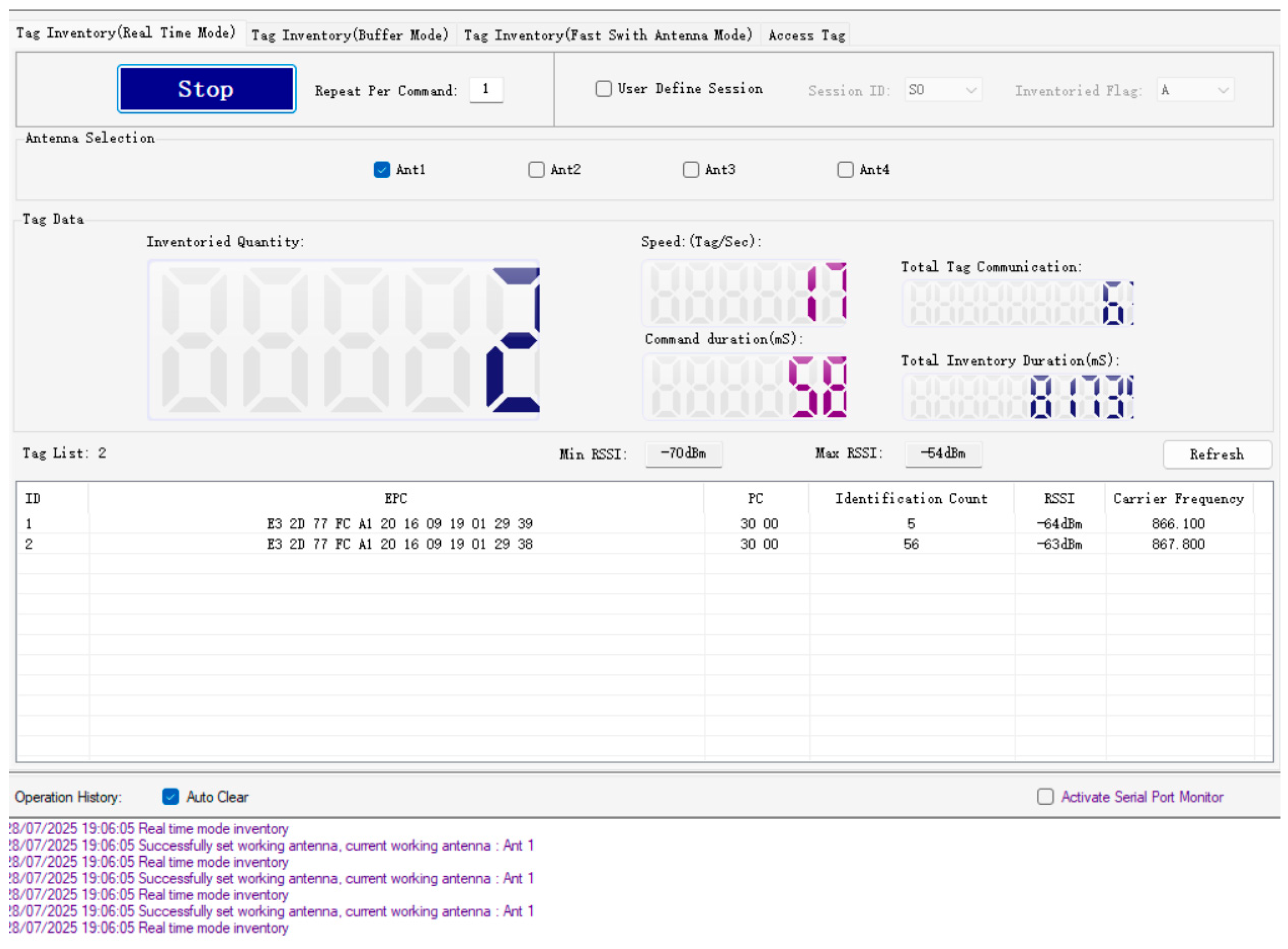 The test results confirm that all readings were performed with optimal accuracy. The reader correctly identified the number of tags entering the reading field, and no delays or reading errors were detected during the experiment. An example of multiple tags detection is presented in