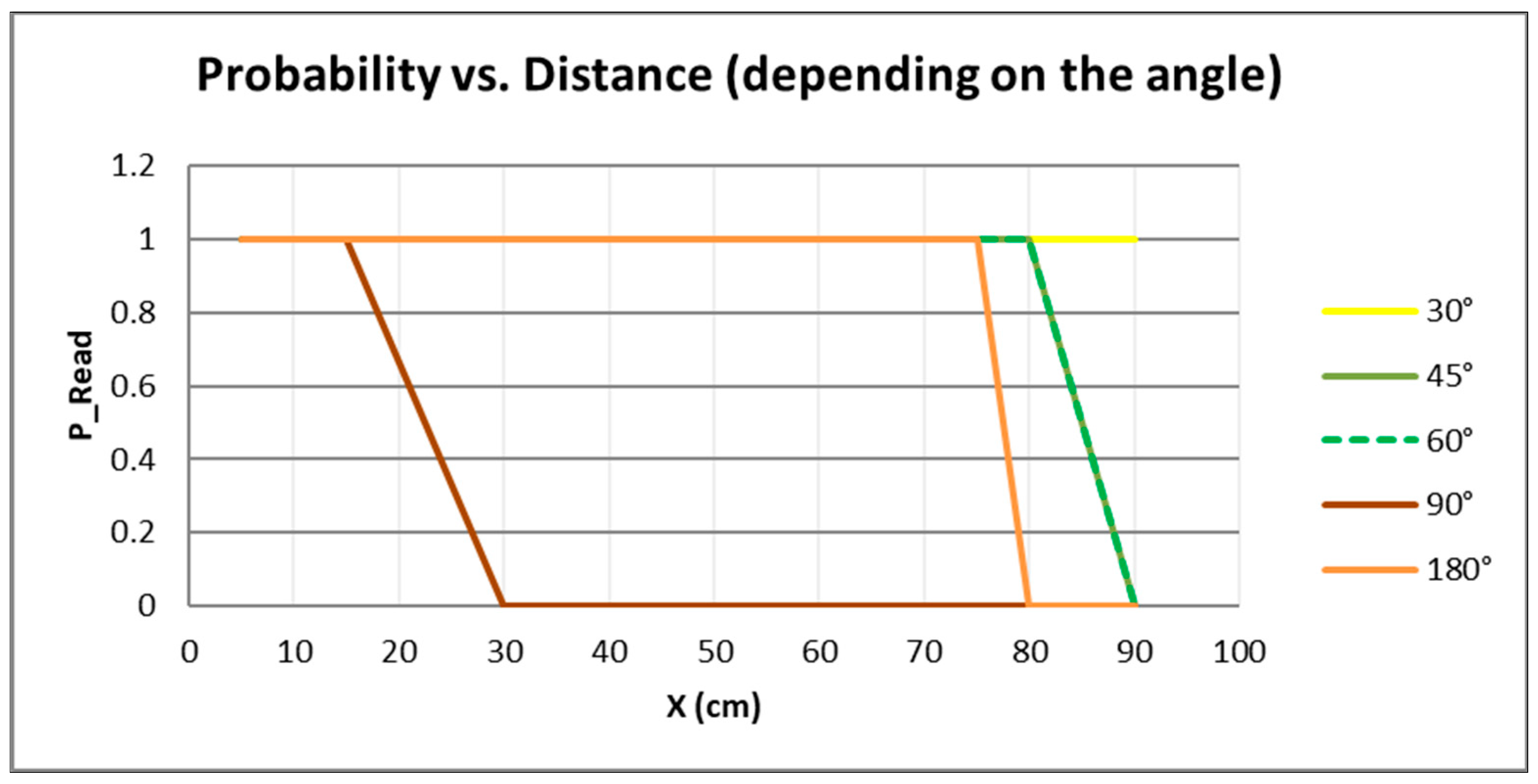 Orientations between 30° and 60° provide the most favourable detection conditions, with maximum reading distances of up to 80–90 cm.