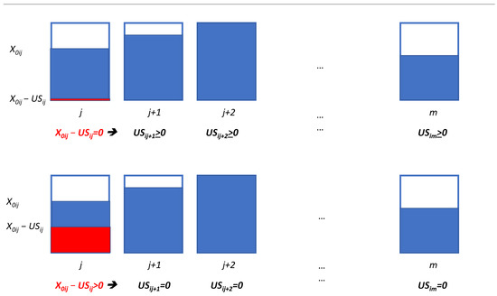 Figure 1 shows how these variables can be used to model the FIFO constraints for the assignment of the initial stock. The figure represents two possible cases. For each case, the bins are represented. For each bin, the rectangle in blue corresponds to the quantity of SKU i assigned to the bin as initial stock, while the rectangle in red in the bin j corresponds to the quantity of SKU i left after picking units from this bin. In the first case, i.e., the one corresponding to the top part of the figure, since the quantity available in the bin j after picking units is equal to 0, a non–negative quantity can be picked from bins . Instead, in the second case, i.e., the one corresponding to the bottom part of the figure, since is greater than 0, then for any successive bin . Therefore, as required by the FIFO logic, bins cannot be used until bin j is empty. We need a set of constraints that guarantee that, given any SKU i and any bin j at which the initial stock of i is assigned, if bin j has some residual quantity of SKU i after having picked the quantity (i.e., ), then for any bin . Therefore, no quantity can be picked from any bin , i.e., for any bin . To obtain this, Constraint (8) is first replaced by the following constraints: