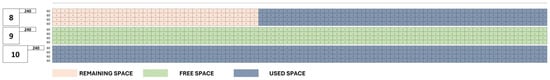 Figure 2 shows a graphical example of what has just been described: 8, 9, and 10 are three bins, each having a capacity of 240 pallets. Each bin is composed of four parallel rows of 60 pallets each. Bin 8 is not free, but it has remaining space that can be used only to allocate the same SKU in the future. Bin 9 is free, as no SKUs are currently assigned to it. Any SKU can be assigned to it in the future. Finally, bin 10 is neither free nor has remaining free space, as it is completely occupied by SKUs.