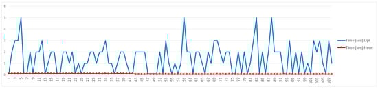 Figure 4 shows, for each of the 108 instances, the computational time required to compute the optimal solution and the heuristic solution. The time required by the company is estimated to be 600 s for each instance.
