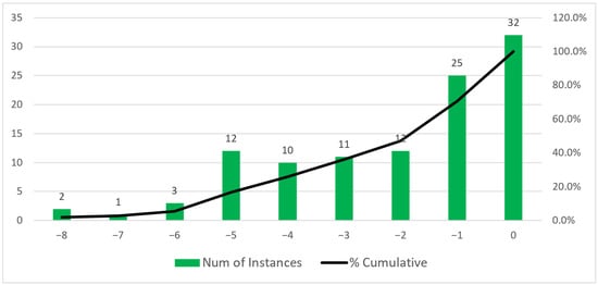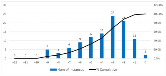 We now perform some additional analyses to better understand the results we obtained. In Figure 5 we compare the optimal solution with the company solution in terms of how many bins are saved. The comparison shows that the optimal solution uses up to eight bins less than the company solution in about 8.3% of the instances, up to four bins less in of the instances, and up to one bin less in 98.1% of the instances. Finally, in only two cases (about 1.8% of the instances) is the number of bins the same. Figure 6 shows the same type of analysis when we compare the heuristic solution with the company solution. The comparison shows that, in a large part of the instances, the heuristic solution uses a lower number of bins. In 70 out of 108 instances (64.8%), the difference ranges from minus 5 bins to minus 1 bin. However, in of the instances, there is no gap. Finally, the heuristic solution never uses more bins than the company solution. The heuristic approach was designed by studying the business approach. The number of instances without gaps could be representative of the idea of taking care of the operational rules in the optimization approach.