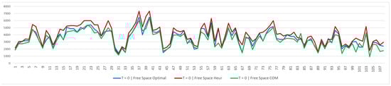 The free space in the optimal model is very similar to the one in the company’s solution at time period 0, while the heuristic algorithm results in more free space. Conversely, the situation changes when looking at the results obtained in time period 1. The gap between the optimal solution and the company solution becomes wider, and the heuristic solution continues to result in more free space, but is very similar to the optimal solution.