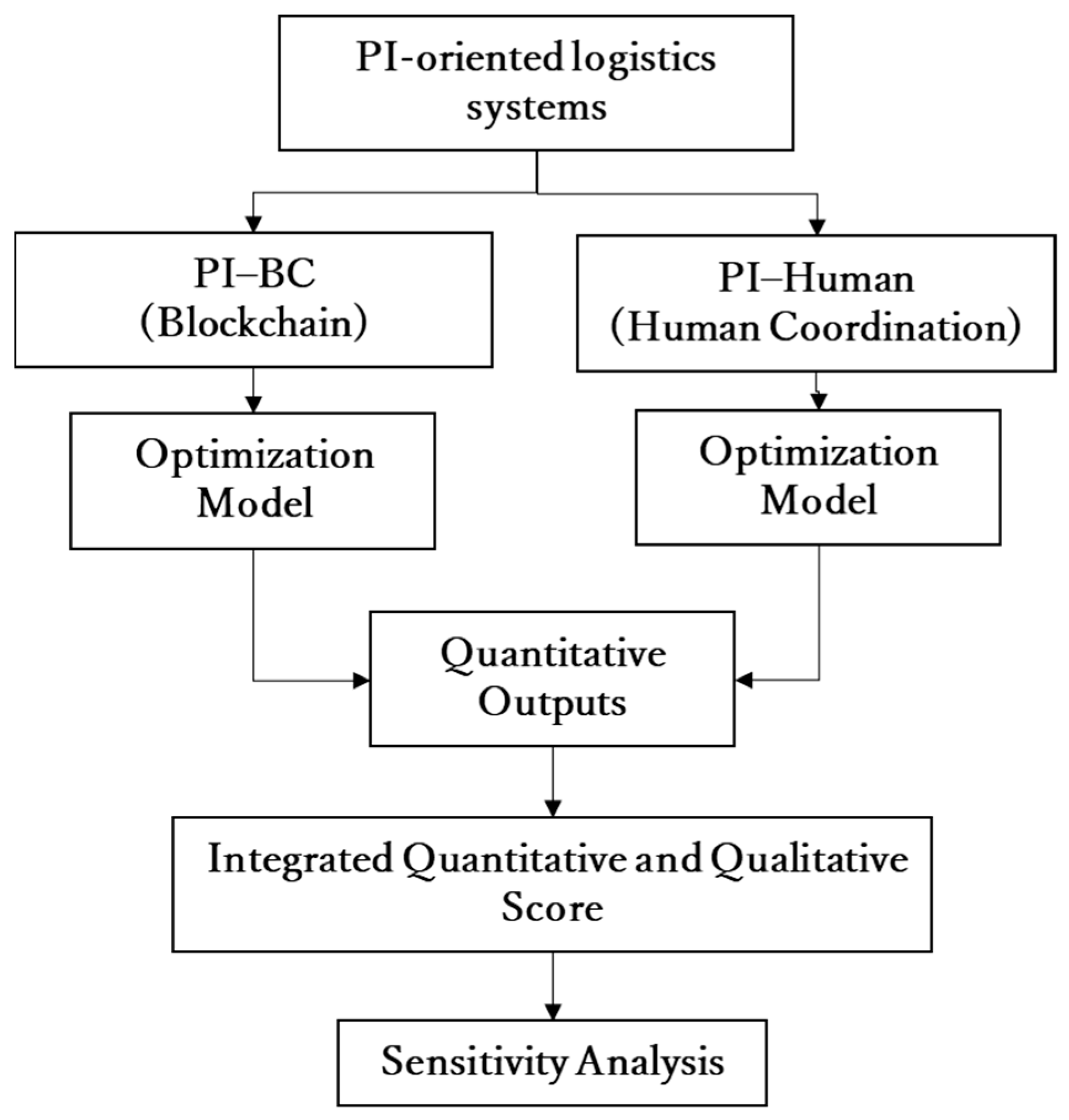 The optimization model integrates transportation cost, operational factors, and coordination mechanisms into a unified framework for comparing PI–BC and PI–Human systems. The objective functions in Equations (1) and (2) capture the fundamental trade-off between operational efficiency and the cost of maintaining coordination. Equation (1) includes blockchain-specific elements such as system development and maintenance fees, on-chain transaction fees, and distributed data storage costs, reflecting the decentralized architecture of PI–BC. In contrast, Equation (2) incorporates organizational coordination cost, which represents the manual reconciliation, negotiation, and trust-building efforts required in the PI–Human scenario.