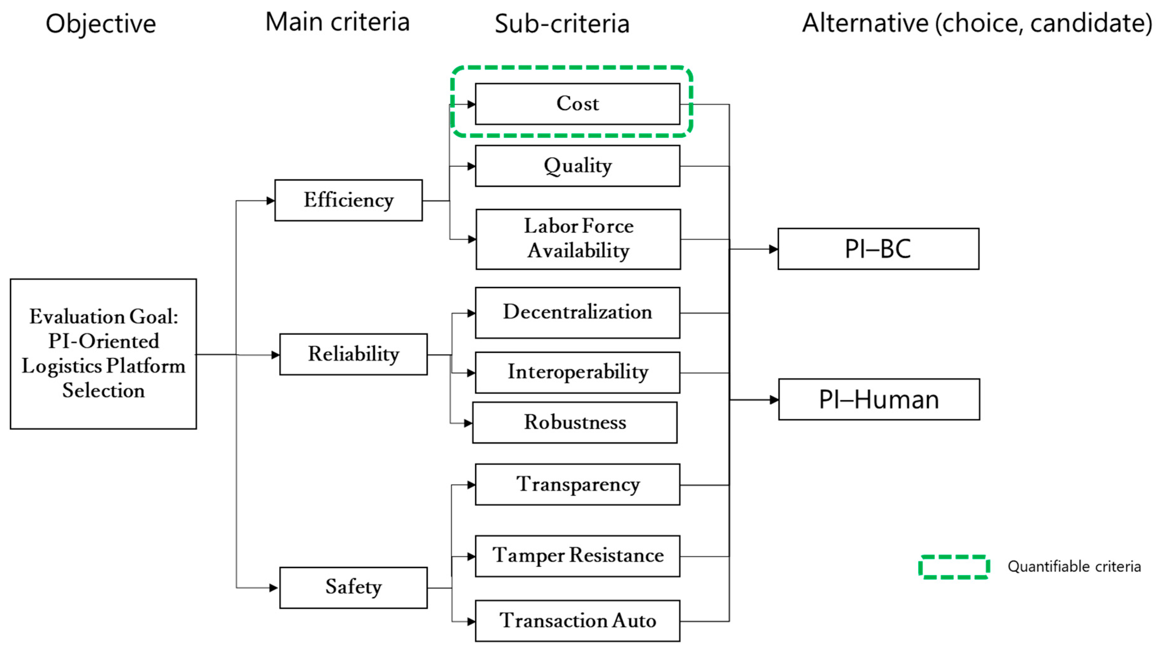 In the context of the Physical Internet, the evaluation criteria are designed to capture both the economic performance and the coordination quality of logistics networks under different coordination mechanisms. Each criterion reflects a specific dimension that influences the validity of blockchain adoption decisions. Efficiency-related criteria assess whether blockchain-enabled coordination can achieve acceptable operational performance under cost and resource constraints. Reliability-related criteria capture the ability of the coordination mechanism to support stable, interoperable, and resilient network operations in highly interconnected PI environments. Safety-related criteria focus on trust, data integrity, and automation capabilities, which are central to blockchain’s proposed advantages over traditional human-centered coordination. The selection of evaluation criteria was informed by prior studies in logistics performance assessment and blockchain adoption in supply chains.