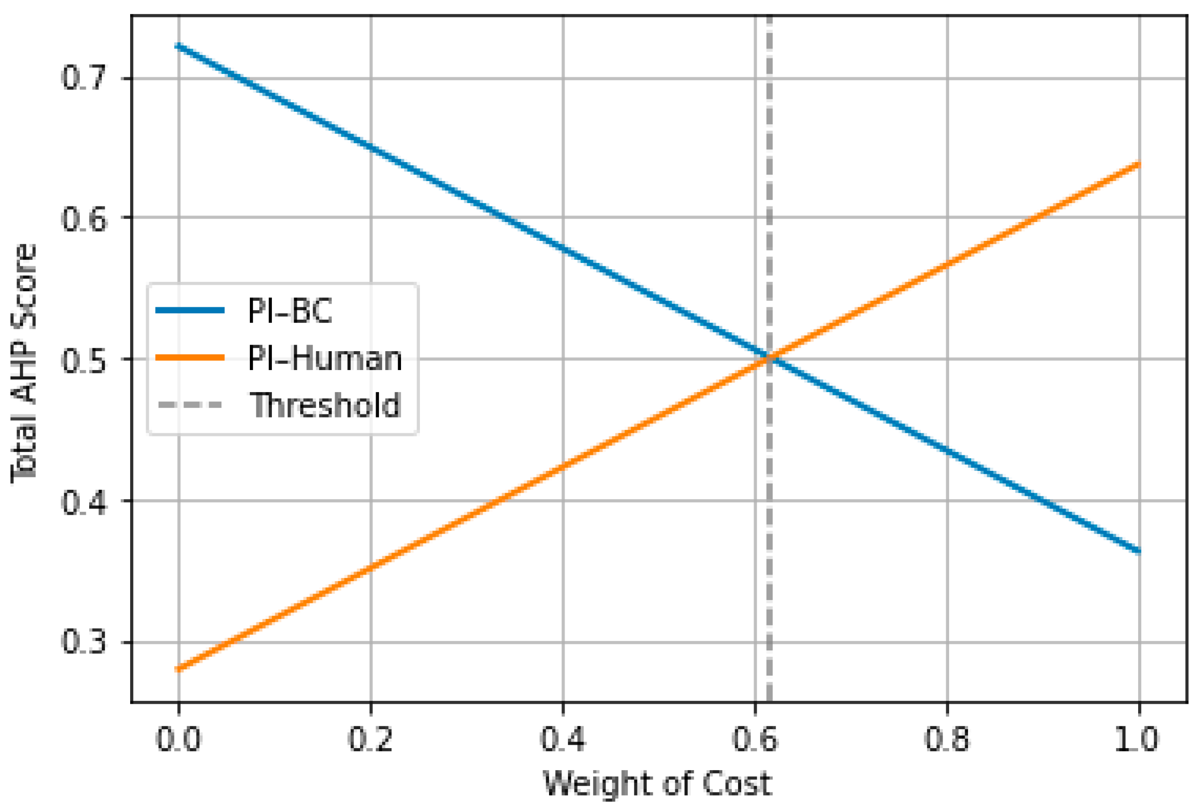 Section 4.3) will further explore how changes in these key parameters, especially when decision-makers assign different importance to different criteria, affect the relative advantage of each option. This also helps address the uncertainty inherent in these modeling assumptions.