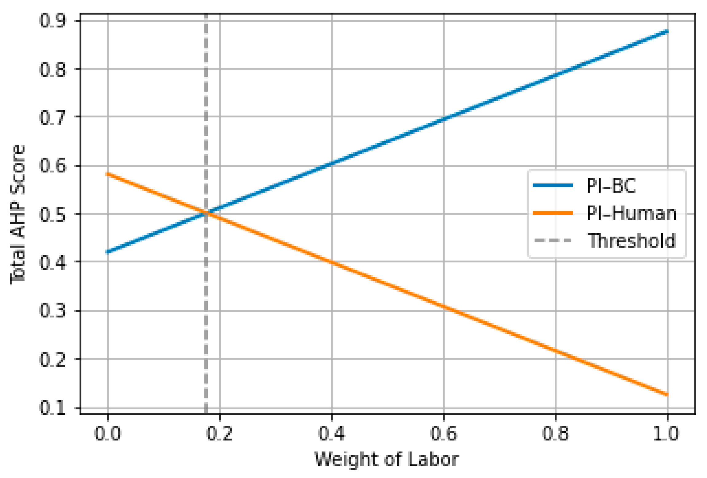 In our numerical experiment, the parameter values ( = 500 $, = 1.5 $, = 0.2 $, = 0.5 $) are set to represent a reasonable early-stage adoption scenario. At this stage, blockchain technology costs are noticeably higher than traditional coordination costs, but not so high that blockchain becomes completely impractical. We intentionally chose these values to ensure that both options have their own strengths and weaknesses in the AHP evaluation, creating a meaningful trade-off situation rather than a one-sided result.