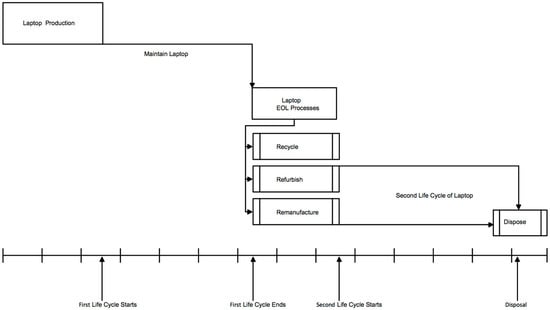 After laptops are produced and sold to the customers, the first life cycle starts. In this phase, if a laptop fails, service is provided to the customer. Once laptops complete their useful lives, they are utilized for several EOL processes such as recycling, refurbishing, and/or remanufacturing.