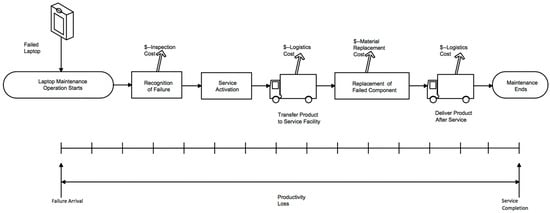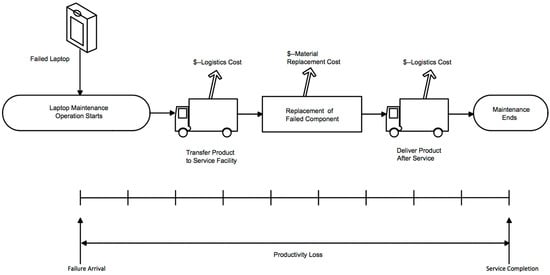In RL systems, once the laptops fail, they are inspected to determine which of the components failed. The information about the failure is transmitted to the service personnel who conduct the required service operations; for example, replacing the failed component or components. These operations are represented by the recognition of failure and service activation processes, which are presented in Figure 3. After this process, failed laptops are transferred to the service facility. The replacement process takes place, and laptops are brought back to working condition. Once the service operations are complete, the products are returned to the customers.