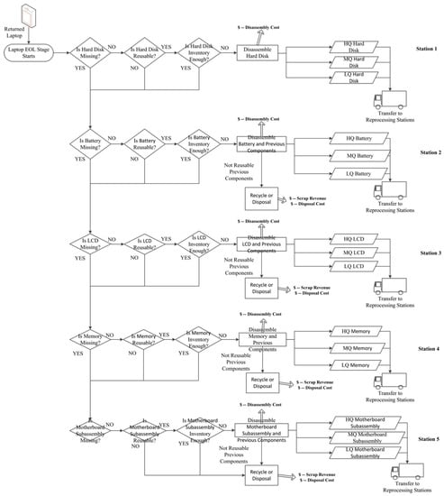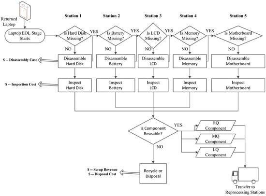 In RL systems, components are disassembled via a disassembly line that follows the given sequence unless they are missing. If a component is missing, the laptop is sent to the next station. The disassembly cost is the function of labor cost and the time required to disassemble the components. As mentioned in the previous sections, inspection follows the disassembly process and is necessary for determining the reusability and quality levels of the components. The inspection costs differ according to inspection time, labor cost, and machining cost. After the inspection process, EOL processes are performed based on the determinations given in the component flows for each quality level. Figure 5 presents the details of EOL processes associated with RL systems that were considered in this research.
