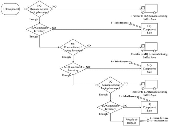 The HQ-component flow includes each quality level in the flow. If the maximum HQ remanufactured laptop inventory level is not reached in the system, HQ components are sent to the HQ remanufacturing buffer area. Otherwise, the maximum HQ component inventory is checked for component sale. If the maximum HQ component inventory level is reached, HQ components are sent for use in MQ processes instead of being recycled because they can increase the quality of the MQ level either by using them for remanufacturing or selling them as components. A similar flow can be observed in the MQ level. If the HQ components are not required at the MQ level, they can be used at the LQ level. If none of the options are chosen, HQ components are recycled or disposed of based on the materials they contain. Figure 7 depicts the HQ component flow.