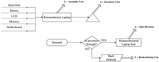 In the current study, demand was anticipated to follow a Poisson distribution. If inventory is sufficient to fulfill the demand, remanufactured laptops are sold, and revenue is generated. If the inventory is insufficient, demand is backordered and the backordering costs in the system increase. Figure 8 reveals the remanufacturing and demand flow of the laptops and the relevant revenue and costs.