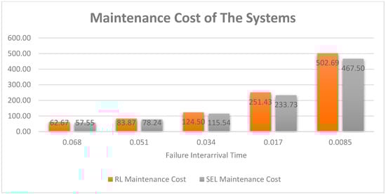 The maintenance costs of the systems modeled in the current study consisted of several subcategory costs such as labor cost, productivity loss cost, material replacement cost, and logistics costs. Some of the factors that might make difference between SEL and RL systems were considered in the factorial design and can be observed in Table 7. The time taken to recognize the problem and activate the laptop service was among them. In addition, the time at which the failure was inspected was also included, and it was assumed that this followed a normal distribution. The mean and standard deviation values of the normal distribution are presented in the parenthesis in Table 7.
