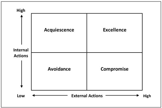 Based on the assumption of potential variation between internal and external actions, we combine these dimensions to propose four ideal types of carbon disclosure strategies. We integrate three strategies of Acquiescence, Compromise and Avoidance in our model that companies may enact in response to institutional and stakeholder pressures, as proposed by Oliver [22]. However, to reflect the context of carbon disclosure, we extend that view by adding another strategy type called Excellence to illustrate internal and external actions that go beyond isomorphic pressures and market demands. Figure 1 depicts the four types, but it needs to be emphasized that internal and external actions are dynamic dimensions, and that carbon disclosure can therefore vary between the ideal types. Below, we describe each ideal type in our model and explain how it implies a distinct level of carbon disclosure.