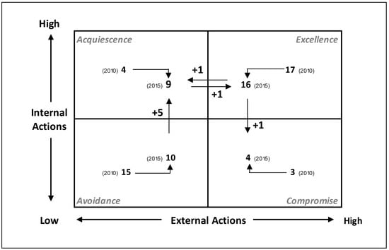 The results are shown in Figure 2, where we placed each company based on their respective internal and external CMPs score, once with scores from 2010, and once with the scores from 2015. This gives us the opportunity to analyze the movement within the strategies. In 2010, out of 39 companies, 15 companies (38%) were allocated into the Avoidance type, while 17 companies (44%) were allocated into the Excellence type, representing more than 80% of all companies. In 2015, however, only 10 companies (26%) were allocated into the Avoidance type, while 16 companies (41%) were allocated into the Excellence type, representing shift in strategies over time.
