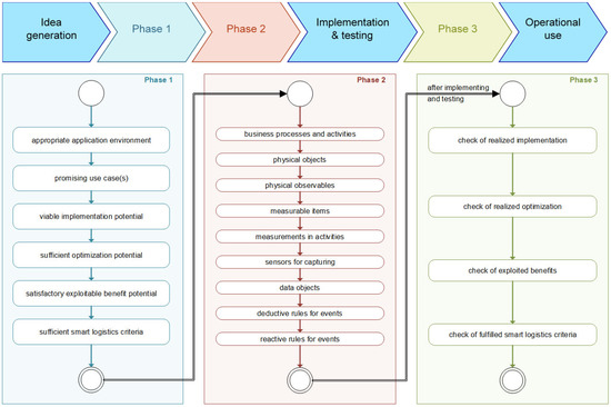 After the initial idea generation, Phase One commences with an appropriate environment for the smart logistics process applications to be identified. Furthermore, promising use cases need to be determined and their implementation potential needs to be evaluated. The expenditure must be within a reasonable proportion to the potential benefit. Further, the benefit potential has to be actually exploitable. Lastly, it has to be checked if the smart logistics criteria apply. Whereas, the first four steps of phase one can best be addressed by the decision-makers from practice, the benefit potential and the smart logistics criteria were assessed alongside the workshop moderators, as presented in earlier works [1]. Scientifically spoken, the inclusion of Schulze’s benefit categorization and Uckelmann’s smart logistics criteria is useful in order to safeguard the suitable character of the respective solution [4,23]. In practice, the authors suggest that at least four of the eight characteristics are fulfilled. However, this may be dependent on the specific transportation and logistics process.