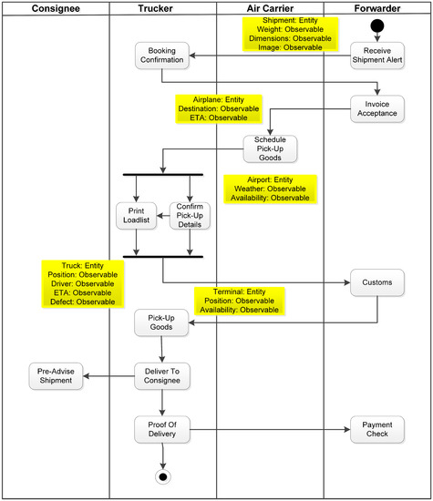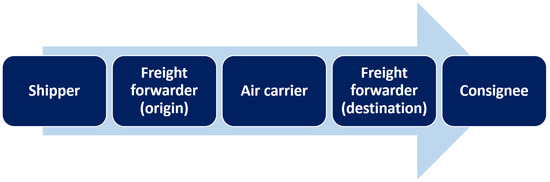 The first use case example refers to a large multinational company—one of the leading global logistics service providers, which does not only offer transport services via sea, air, and land, but also contract logistics, value-added services, and other solutions. Consequently, the complexity of their processes is high because countless variables have to be taken into account for the decisions to be made and the tasks to be completed to the ultimate satisfaction of the customer. Important for the presented approach is not to look at a transportation process as a whole, for instance, but to focus on a particular fraction of it. Instead of contemplating a global transportation from the origin to the destination, the considered transportation process is divided into legs, which are then considered isolatedly. Furthermore, the process is divided into four general phases: sales and alignment, planning, execution, and completion [27]. As can be seen in Figure 2, the considered process in this case refers to the transportation of general cargo. Each box in the figure represents a participant of a typical supply chain who is in charge of a certain process step and in possession of the goods to be hauled. The process starts with a trucker bringing the goods from a shipper company to an airport, possibly with an intermediate handling at the premises of the freight forwarder. From the airport, the goods are flown to the destination airport before a truck forwards the goods to the consignee ultimately. As the whole process is too complex for an examination of the applicability of CPS and CEP, the use case is confined to the post-run from the destination airport to the consignee.