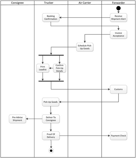 The entire post-run is illustrated as an activity diagram in Figure 3. The swim lanes represent four parties: consignee, trucker, air carrier, and forwarder. The company of the use case example acts as the forwarder who firstly receives a shipment alert from the air cargo carrier or the airport.