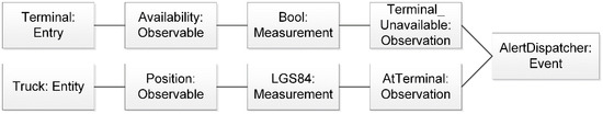 Secondly, the observation whether the truck is at the terminal at all must be made. If these two situations are answered negatively, meaning yes for the unavailability of the terminal and no for the observation whether the truck is at the terminal, the dispatcher has to be contacted. However, for both observations to be made, there are some deductive rules to be established. For the terminal as an entity, the occupancy status can be observed and easily measured as the answer is Boolean (and therefore either yes or no). For the truck, it is almost the same. The current position must be observed, and the exact geo-position derived. It is also important to note that both observations have to occur in order to have the dispatcher be alerted. If the terminal is unavailable while the geo-coordinates show that the truck is 200 kilometers far away, the unavailability of the terminal does not have any relevance at this point, and, thus, does not lead to any event-triggered action.