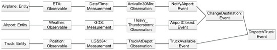 The second complex event (see Figure 5) is more complicated and concludes in the exception “DispatchTruck” and is in the context of a plane not being able to land at a certain airport due to a heavy thunderstorm. This means that different variables lead to the event of another truck nearer to the new airport being dispatched. Consequently, the reason for the truck dispatch is the complex event of a change of destination. First of all, the pilot must notify the airport that he will land in thirty minutes, for instance. This can easily be observed via the estimated time of arrival, which again is constantly updated based on the speed, the movement rate, the current geo-position, and further influential factors, such as weather or traffic. In the meantime, it will be indicated to the pilot that the airport is closed because a thunderstorm is too heavy. The weather situation at the airport can be observed via the geo-coordinates and respective websites on the internet. Therefore, two single events have to occur to confirm that a destination switch is inevitable. The pilot has to notify the airport about the landing and the airport must be closed. If one or the other does not occur, a switch of destination is not necessary. Also important is the availability of a second truck to pick up the goods, because the pilot will need to approach another airport as alternative destination.