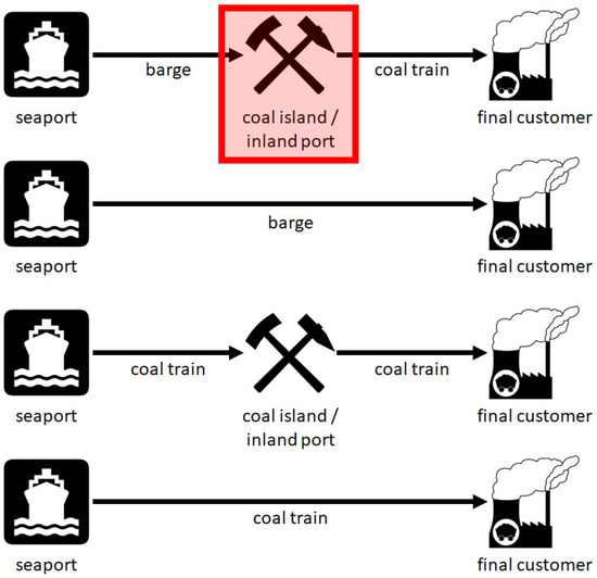 The second use case example presents a medium-sized rail freight haulage company located in the west of Germany. It mainly transports dry bulk goods, such as coal and ores, and handles those goods at its own ports and storage locations. Furthermore, the enterprise offers solutions regarding rail transport, storage, and customs of bulk goods. Like the first company, this company operates on the entire European continent and is connected to virtually all parts of the world through global supply chains. Yet, the emphasis is not on the transportation, but on the handling processes between different legs. The entire process of this transportation would be from a seaport to a power plant as the final customer, typically via several intermediate steps at which the handling or storage processes take place. The company operates in different environments with heterogeneous transport mode combinations, as is illustrated in Figure 7. In the following explanation, the focus will be more closely on the process course. The transportation goes from a seaport to another seaport and from there via an inland port to the final customer. Usually, mistakes and deviations happen in a real-world environment all the time. In this case, several handling processes between the different transport modes typically exist. Because of that, it is most important for the company to optimize the handling processes, as these consume a major amount of the total process time. Also, the company offers two kinds of transportation services: pick-up and delivery. On the one hand, there is the pick-up service of loaded barges or trains from the seaport. Typically, the barge receives the bulk goods from the ocean vessel at the seaport before the train takes on the load from the barge at some later point in the process and ships it to its destination. On the other hand, there are also deliveries in which a barge or a train is on the way to the customer for the final delivery of the bulk cargo. Both services are accompanied by empty runs to or from the destination. In addition, both services can be combined in the way that arriving cargo is picked up and directly transported to the final customer.