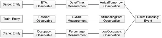 The first exception, as illustrated in Figure 9, is the exception of a direct handling and it only considers the handling from a barge coming from the seaport on a train going to the final customer. The complex event of a direct handling also represents the reactive rule, and for this rule to come into effect, three deductive rules were derived. Accordingly, the question being asked here is how a direct handling can be detected. If the barge arrives at the handling port tomorrow, the train is at the same port tomorrow as well and the occupancy of the crane is low enough to handle both the barge and the train, then a direct handling from the barge to the train is possible. If one of those conditions does not apply, then a direct handling cannot happen. For the barge, the estimated time of arrival can be observed. If the train is at the handling port can be found out via its position and the geo-coordinates of the train can be measured and matched with the ones of the handling port. For the crane, the occupancy percentage can be measured.