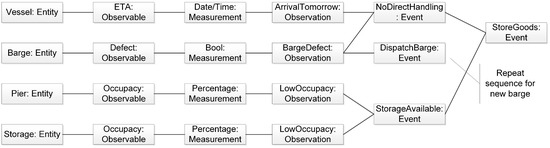 The second exception “StoreGoods” (see Figure 10) is more complex than the first one and it presents the opposite of the previously described one: if the complex event “StoreGoods” is derived, a complex event “DirectHandling” is logically not possible. Four entities have a role in this complex event. The first entity is the vessel. Its estimated time of arrival is observable, date and time are both measurable. From these two indicators, it can be observed that the vessel will arrive tomorrow. At the second entity, the barge, a defect can be observed. The answer to the defect is either yes or no and, therefore, of Boolean nature. The conclusion that the barge is defect is the following observation and leads to the dispatch of another barge which is also a different complex event. Combining the results of the vessel and the barge alone, it can be concluded that a direct handling is not possible. If the process has reached this point, the storage suddenly becomes important. Now, the barge needs to find a pier where it can stay during its clearance. The occupancy of the respective pier can be observed as a Boolean value. The fourth entity is the actual storage. The occupancy and the free capacity are observable and measurable, respectively. As it may happen that a direct handling is not possible, it is important to have enough spare capacity in the storage to store the goods temporarily. So, if a barge is defect, another barge will be dispatched to load the goods from the vessel and will bring them to the storage facility. For the new barge, the same sequence has to be gone through because it could be defect as well.