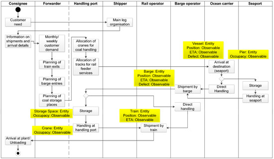 In Figure 11, the already known activity diagram with detectable events is shown again. The difference between the previous one and this one is that this time different exceptions are included at certain steps of the process. These single events added up would result in the aforementioned exceptions of “DirectHandling” and “StoreGoods”. It is important to note that the single events do not occur at only one step of the process but at different steps. The combination of detectable exceptions at different times of the process yield the complex events. Figure 11 shows the events belonging to the respective exceptions within the transshipment use case example. The first single events are at the destination seaport. At this point, it is possible to detect the pier and its occupancy status, as well as the vessel with its position, its arrival time and its possible defect status. However, the pier and the vessel are not directly related to each other. At the process step “shipment by barge”, the barge is the entity whose position, estimated time of arrival and defect status are observable. At the handling port, storage acts as an entity whose the occupancy is observable. Regarding the handling at the handling port in particular, the cranes are the entities whose occupancy is observable. Arranged correctly, these exceptions make up for the two exceptions in this process.