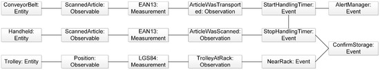 After the item was scanned and put on the conveyor belt, the observation that the item was transported can be made. At this point, a timer starts which concludes in the event “StartHandlingTimer”. If this time exceeds an allowed tolerance range, a manager has to be alerted to take a look whether there is a problem in the process. If the item reaches the end of the conveyor, it is scanned with a hand-held computer and the observation that the item was scanned can be confirmed. This indicates a seamless sequence up to this point and the single event “StopHandlingTimer” comes into effect. At the same time, the item is put on a trolley and is manually moved towards the storage rack where it needs to be stored. On the item arriving at the right place, the storage place and the item are scanned, which concludes in the single event “NearRack”. Consequently, when this event occurs, the final complex event “ConfirmStorage” has taken place.