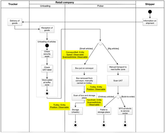 In Figure 14, the activity diagram with the exceptions for the third use case example is illustrated. Again, the pertaining single events are spread around the whole process and they occur at different times as well. The different entities, for example, can be seen at four different process steps at which single events like position or speed information can be detected. The complex event “ConfirmStorage” is consolidated from these single events.