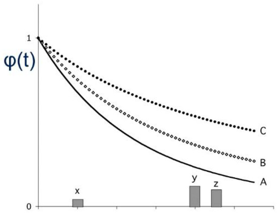 Decreasing impatience describes time-inconsistent behavior and serves as a selection criterion for representations, as in the following two-stage decision problem (see Figure 1): for someone, the choice is given to either immediately (at time 0) go for an outcome z out of x < z < y with utilities u(x) < u(z) < u(y), or to wait until some fixed later time at which all three choices, each at a fixed point in time, become available. Even though z is inferior to y, since it is both delayed further and less in value (as indicated by the height of the bars in Figure 1 below), there may very well exist utility combinations that would make an agent pick the dominated choice z at time 0 as a measure of commitment or self-restraint, anticipating that at the time x is immediately available, he might go for the instant reward that is x. In this setting, only the discounting behavior according to function C (see below) is compatible with a choice of z, while all three are hyperbolic with different parameter values.