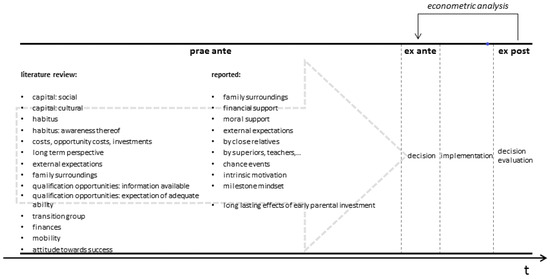 The remainder of this paper is structured as follows: Section 2 provides descriptions of the three perspectives that can be used to examine individual decisions, such as the one given here, to partake in education and training ex post (Section 2.1) and ex ante (Section 2.2). In Section 2.3, we introduce our new perspective on the decision, the “prae ante”-view: we explore and examine decision-informing factors on an individual level, probably arising from an early age up to a point in time just before the actual decision happens. Section 3 elaborates on materials and methods (Section 3.1) and presents our survey results (Section 3.2). Section 4 contains a sketch of its further theoretical foundation. Lastly, Section 5 gives the results and discussion.