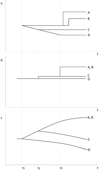 Here we are taking a view on education and training decisions from the perspectives of earnings (e), formal qualification (q), and competence levels (c) over time, where time refers to some time span during the career of an individual, during which an education and training decision happens. In the stylized example shown in Figure 3, we have three instances during some individual’s career, indicated as t1 < t2 < t3. At t1, a decision about an education and training measure is taken. In Figure 3 we have depicted individual education and training paths (marked A, B, C, and D). An ex ante view temporally corresponds to t1, ex post corresponds to any t > t3. We assume the earnings function during a measure to be constant at best (as in cases A and B), or declining, for instance in the case of student loans (C and D). At t > t3 a discrete jump in earnings signifies possible, better employment opportunities taken by the individual (A and B), lagged for reasons of job market frictions. This is assumed part of the individual’s expectations ex ante.
