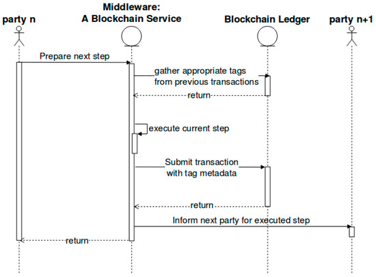 On the proposed schema of Figure 2, each party prepares the next step (stage) of the supply chain by confirming the previous one. In particular, the confirmation takes place by inputting the proper hashes and other proof material output from the previous step. After that, custom smart contracts could be triggered depending on the step, and then, the Middleware confirms the validity of the input and initiates next stage’s procedures. Such procedures would be to gather appropriate transaction hashes, tags or electronic seals, and other ledger information of previous steps, as shown in the figure. The Middleware interacts directly with the blockchain ledger and its blocks that include transactions and all the important tamperproof data. Following this, the supply chain step is eventually executed through the Middleware in an environment that ensures a continuous data validation. After the stage completion, the actions are reported by submitting one or more new transactions on the ledger that includes the appropriate product tags or electronic seals. The new transactions prove in the legitimate circumstances under which the supply chain stage was finished and allow the next stage to be initiated.