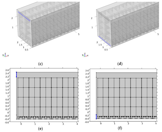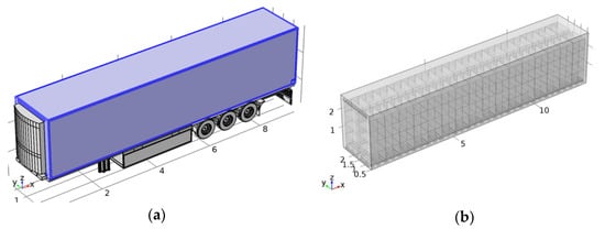 For the 3D analysis of the refrigerated trailer models, ANSYS Fluent 17 is used as the CFD simulation platform. The reason is to benefit from the sophisticated RSM method provided by the ANSYS Fluent software. The RSM method has distinct advantages over other lower order models. Additionally, the RSM better predicts the global behavior of the airflow and the airflow in the narrow air spacings of palletized cargo. It is the most elaborate type of Reynolds-averaged Navier–Stokes (RANS) turbulence model provided by the ANSYS Fluent. For the 2D analysis of the transient models, a more convenient COMSOL Multiphysics 5 is used as the simulation platform. All simulations are performed on an Intel i7-6700, with 8 cores, 3.40 GHz CPU, and 24 GB of RAM.