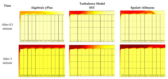The analysis presented hereafter follows these main steps. First, to observe the ventilation of the gaps between palletized cargo in the 2D Model 1, transient turbulence analysis methods are used, such as Algebraic yPlus, SST, and Spalart–Allmaras. Following these methods, for the steady-state analysis of Models 1, 2, and 3, we use the RSM, which is an advanced technique for predicting real-world scenarios. The RSM has a distinct advantage over lower-order models for such flows where the transport of terms such as Reynolds stress or heat flux plays important roles. This is because the transport physics of second-moment terms can be integrated into second-order models. In the next section, numerical analysis and statistical tests are performed. Finally, statistical significances are reported.