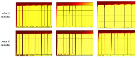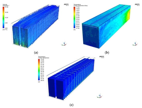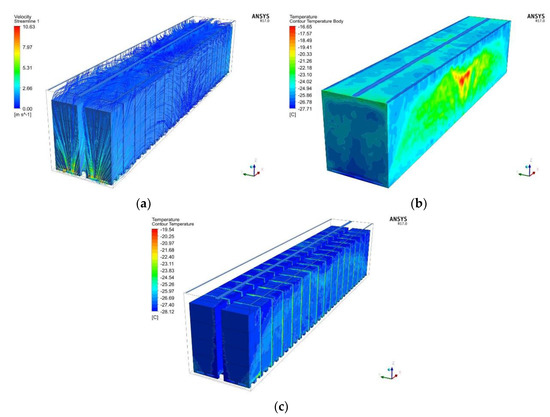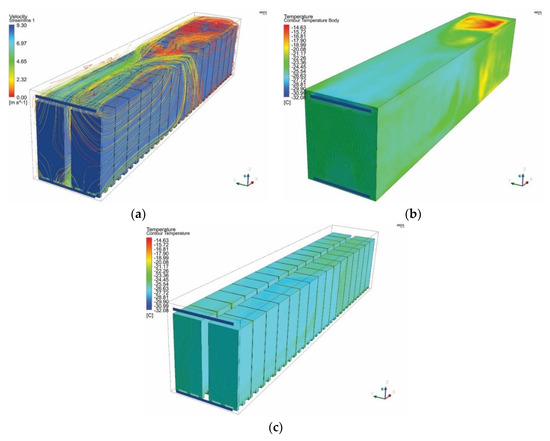 In this model, cold air is blown from the inlet at the top of the trailer (front) and the air returns to the outlet at the bottom. Starting from the inlet, the cold air stream makes turns to avoid the obstacles, which are palletized cargo, and moves toward the empty zones, and the air stream sweeps through the trailer body until reaching the outlet. Low air velocity (Figure 3a) and high product temperature (Figure 3b,c) are observed at the rear. By contrast, high air velocity and low air temperature at the front might lead to partial product chilling. Further, a higher blowing air velocity might result in a lower maximum and mean temperature distribution, as having a higher blowing air velocity from the inlet might improve the temperature distribution inside the trailer body. However, in practice, the blowing air velocity is limited by the equipment manufacturers’ specifications.
