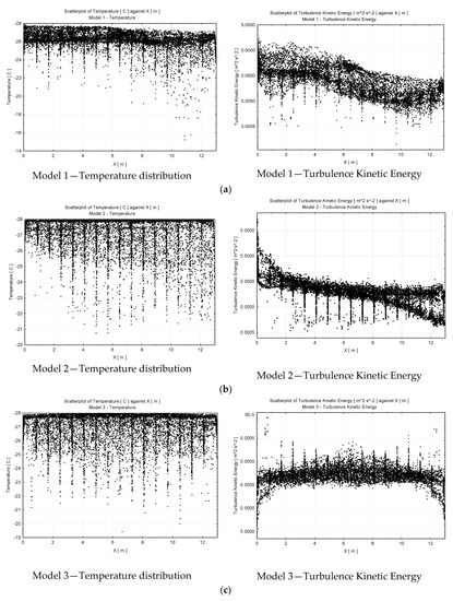 Temperature and turbulence kinetic energy distributions along the x axis of the trailer with sample sizes of 10,000. (a) Model 1: Single outlet–single inlet, (b) Model 2: Single outlet–multiple inlets, (c) Model 3: Multiple outlets–multiple inlets.