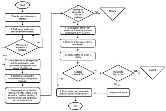 There are several SLR protocols [22,28,39,40]. It was opted for the use of Methodi Ordinatio protocol (Figure 1), proposed by [40]. This protocol was selected because it presents a plan that goes beyond that considered the basic for the achievement of a SLR. The authors add the possibility of classifying articles from the year of publication, number of citations and the journal’s impact factor in which it was published, under a multicriteria decision aid approach, so we believe that there is more rigor in this method.