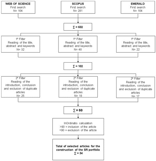 The articles remaining from the second filtering process (74) were ordered via InOrdinatio. [40] recommended the systematic reading of the articles that presents InOrdinatio within a relevant range, to be delimited by the researcher, himself, using his sensitivity in relation to the researched topic. In this case, the first 34 articles were selected, which presented InOrdinatio superior to 90. This selection considered that the works with index below 90 were “distant” from the others, mainly, in terms of impact factor of the periodical and year of publication. Figure 2 presents the results of the filters referring to the systematic review of the literature.