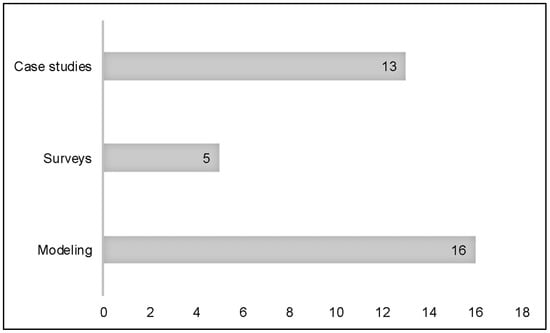 Based on the methods adopted in the development of the articles, the classification was based on an adaptation of the [18] proposal. In this study, the authors classify the articles, based on the methodology used, in theoretical and conceptual studies, case studies, surveys, modeling and literature reviews. In this case, the articles of a bibliographic nature or literature review were excluded because the assumptions of systematic literature reviews presuppose the inclusion of empirical research only [21]. The authors also propose that in cases of articles that present more than one type of methodological procedure, these should be classified according to the main methodology. Figure 3 shows the result of this classification.