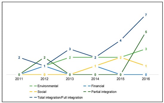 Analyzing the year of publication of the selected articles, Figure 4 presents a graphical distribution where it can be seen that the systemic analysis of the approaches (total integration), that is, environmental, economic and social, overlaps with the others, indicating a “complete” sustainable approach, as advocated by [2]. Partial integration refers to works that have addressed two dimensions, for example, economic and environmental or economic and social.
