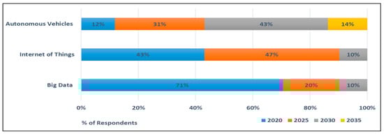 As can be seen from the figure above that out of 51 respondents, the majority (36) postulated that big data would be actively placed in operations by 2020, and only 15 believed it could take another 5 to 10 years to be mature enough for highway operations. According to the responses, the Internet of thing is the second rapidly maturing technological advancement. The results show that 22 organizations think it could be in highway operations by 2020 whereas, 24 believe it would take another 5 years to play its role in highway operations, and only 5 organizations believe it would not be actively used until 2030 in highway operations. The opinions on AV are divided into two equal halves—22 organizations believe that AV technology would mature by 2025 or earlier, and 22 organizations deem it would take another five years to be on the roads. Although, 7 of respondents believe this technological advancement would mature until 2035.
