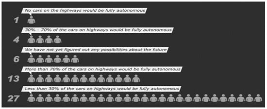 It is observed that majority of the responding organizations are being optimist about the fact that self-driving vehicles (vehicles automation level 4 and 5 [15,16]) will show an exponential growth. The data shows that over 52% of respondents predict less than or equal to 30% vehicles to be autonomous by 2030. Whereas, 33% of organizations predict this to be more than 30%, although how much more varies significantly. However, the percentage of agreement might differ between organizations, but the majority of the organizations agree on the point that the autonomous vehicle revolution is imminent, many more cars will be autonomous and there should be measures in place to accommodate them.