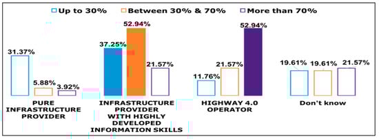 The respondents seem to be inclined to adapt to the B2 business model as autonomous vehicles reach to the level of 30%, which is highly likely to happen by 2030 as discussed in the preceding subheading. However, approximately 31% of respondents voted to adhere to the orthodox business model (B1) and approximately 20% stated they do not know which model they should choose. Approximately 53% would still like to stay as the infrastructure provider with highly developed information skills as the percentages of autonomous cars on highways fluctuates between 30% and 70%. Approximately 22% of respondents would like to adapt to the B3 business model at this stage, and approximately 20% were not sure which model to choose. Approximately 53% are likely to choose the B3 business model and approximately 22% would stay with the B2 business model. A slight percentage of approximately 4% would still like to stay at B1, whereas, approximately 22% are not sure to what they would choose.